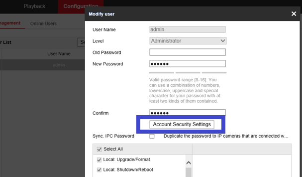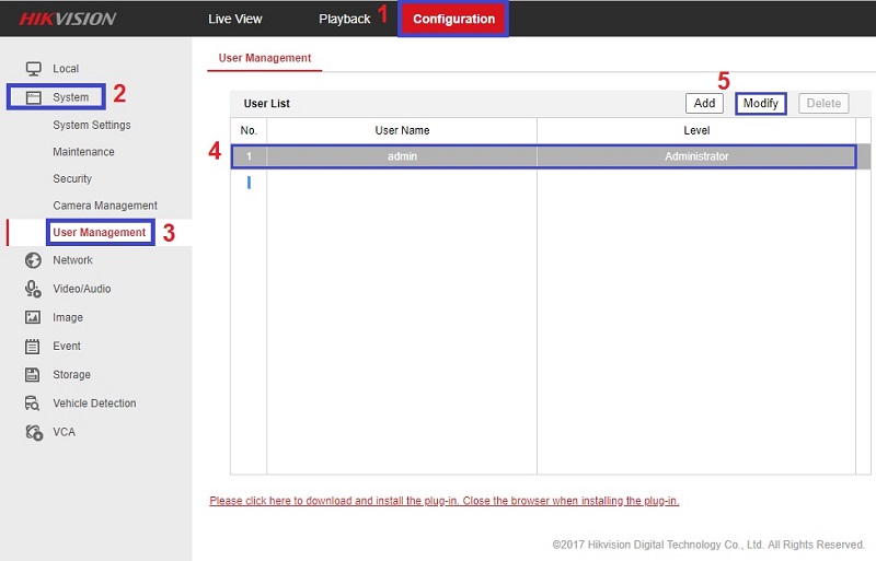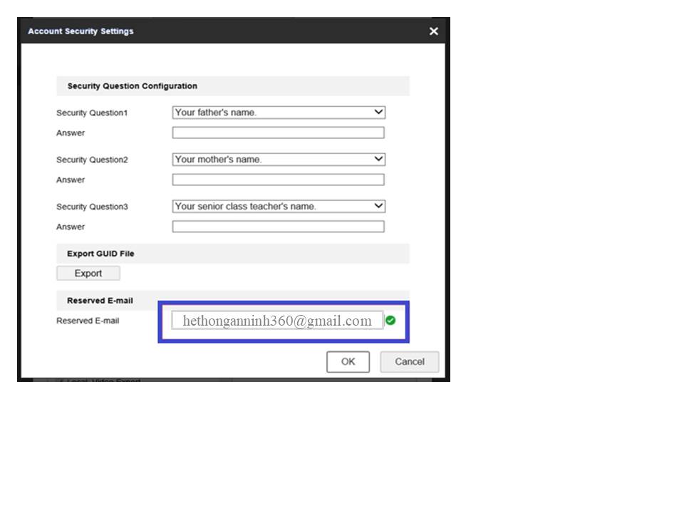 - Hoặc Đăng nhập vào trong thiết bị : Configuaration => System => User Management => Chọn tài khoản admin => Modify => Reverser Email => Nhập địa chỉ email của bạn => Rồi lưu lại