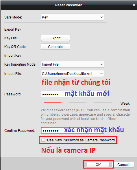 - Nếu là camera IP thì chọn “Use new Password as camera Password“